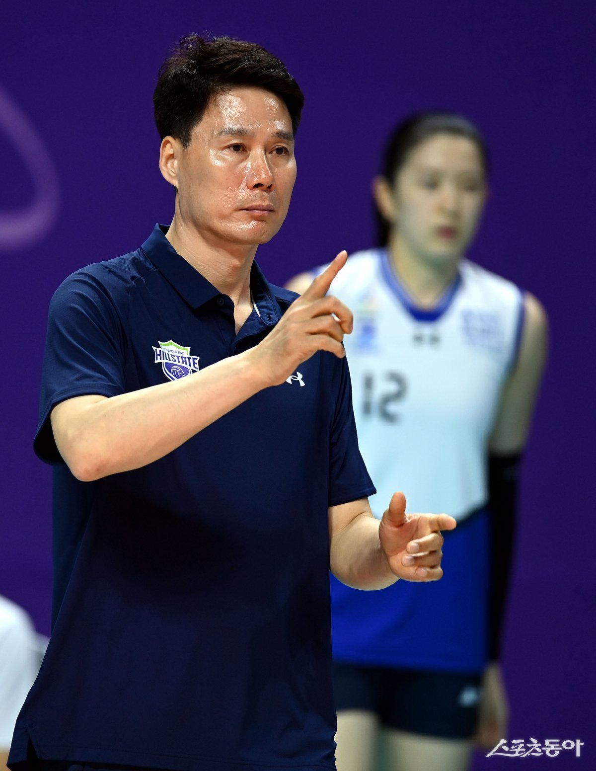 31일 경북 구미시 박정희체육관에서 ‘2023 구미-도드람컵 프로배구대회’ 수원 현대건설과 광주 페퍼저축은행의 여자부 경기가 열렸다. 현대건설 강성형 감독이 선수들에게 작전을 지시하고 있다.