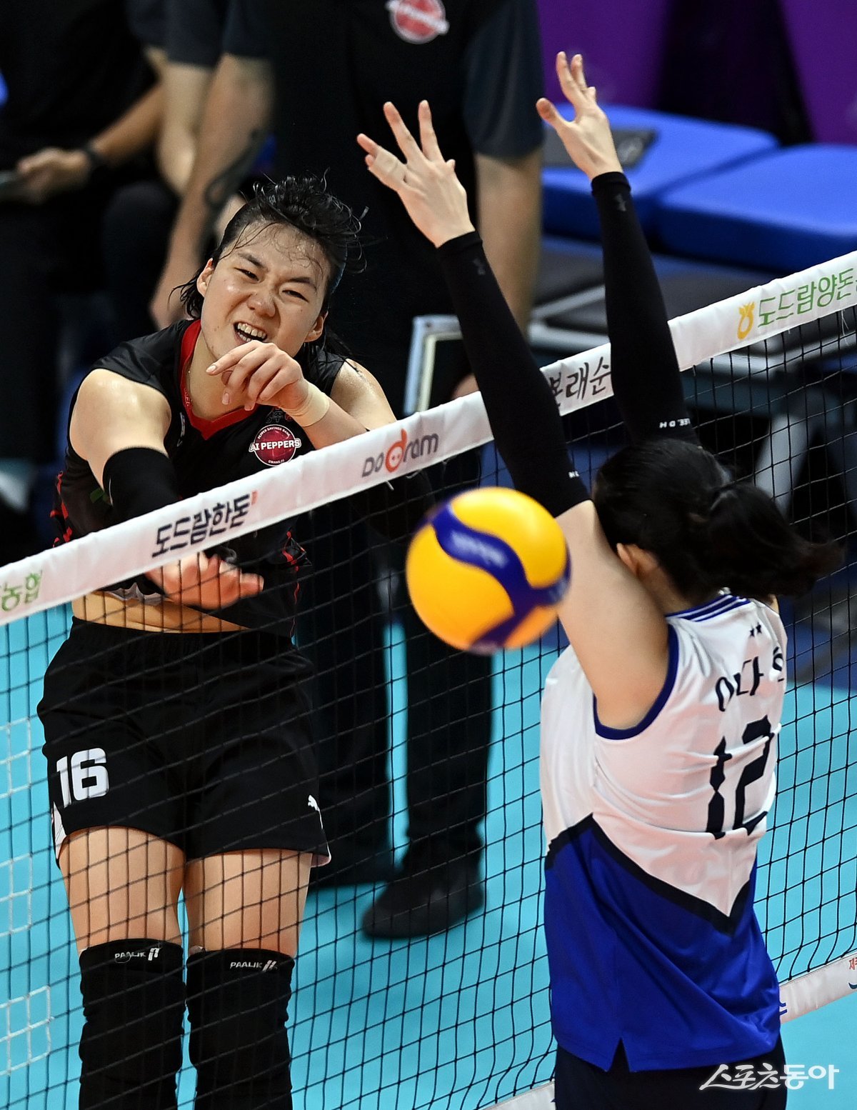 31일 경북 구미시 박정희체육관에서 ‘2023 구미-도드람컵 프로배구대회’ 수원 현대건설과 광주 페퍼저축은행의 여자부 경기가 열렸다. 페퍼저축은행 박은서가 현대건설 블로커를 피해 스파이크를 날리고 있다.