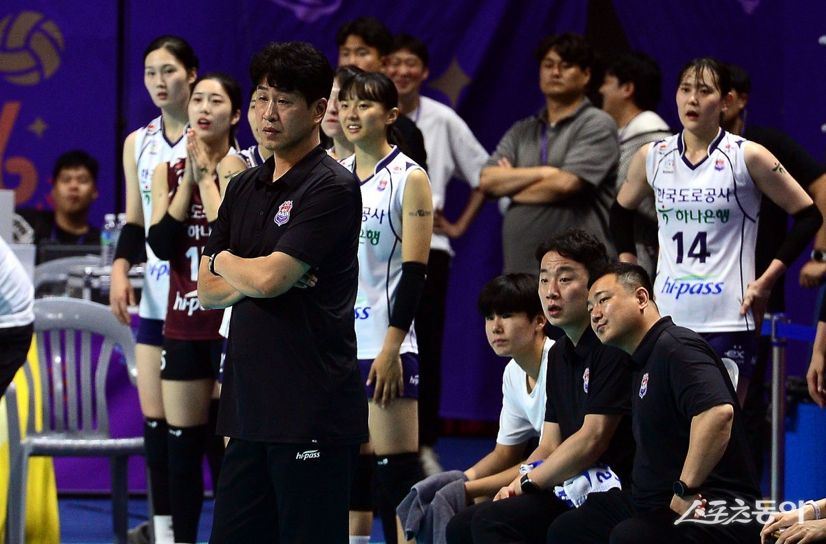 31일 경북 구미시 박정희체육관에서 ‘2023 구미-도드람컵 프로배구대회’ 대전 KGC인삼공사와 김천 한국도로공사의 여자부 경기가 열렸다. 한국도로공사 김종민 감독이 패배를 눈 앞에 두고 아쉬워하고 있다.