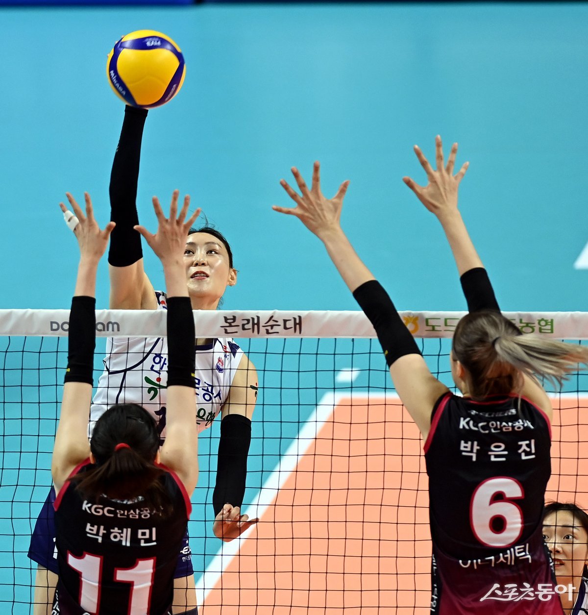 31일 경북 구미시 박정희체육관에서 ‘2023 구미-도드람컵 프로배구대회’ 대전 KGC인삼공사와 김천 한국도로공사의 여자부 경기가 열렸다. 한국도로공사 배유나가 KGC인삼공사 블로커를 피해 공격을 펼치고 있다.
