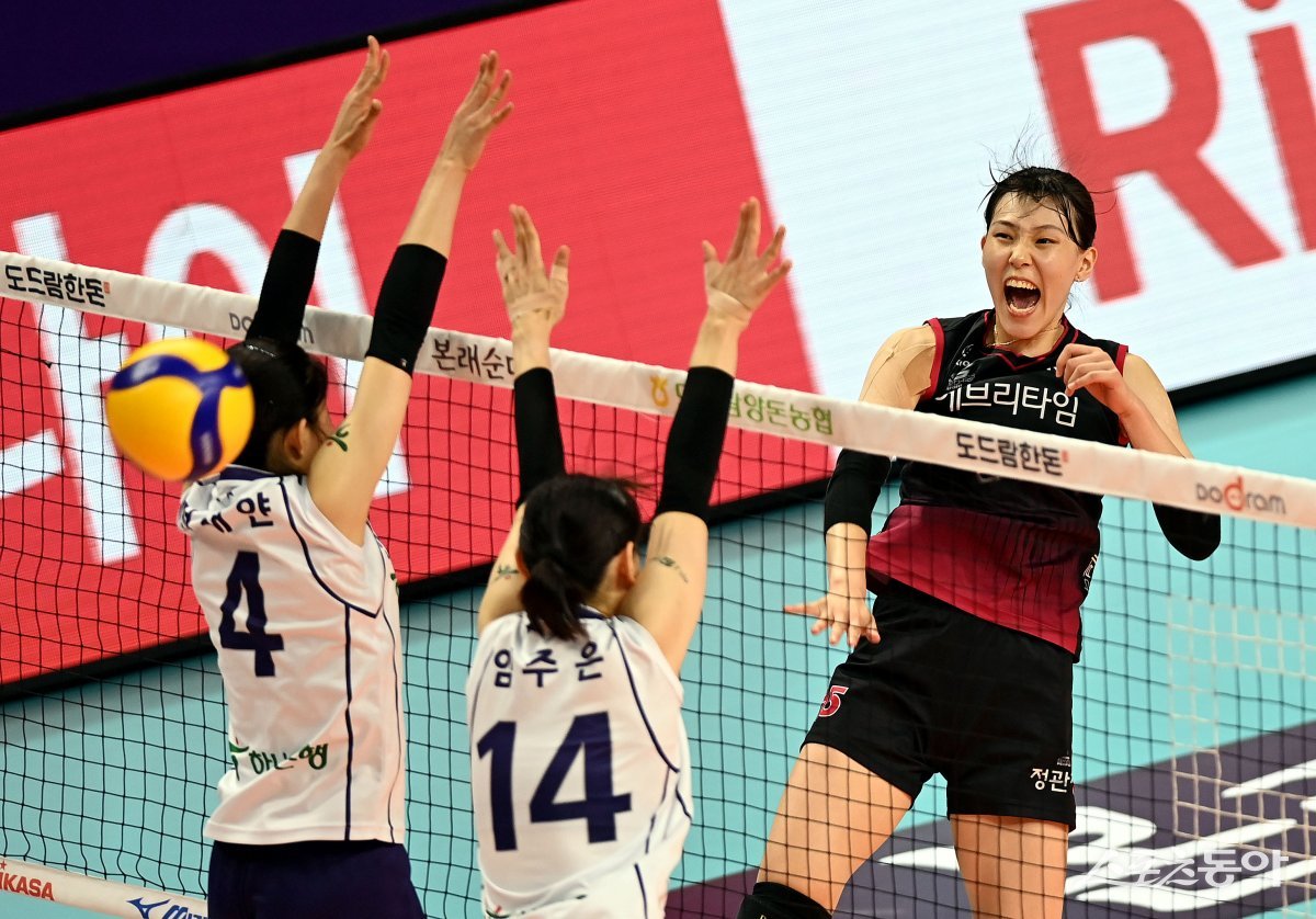 31일 경북 구미시 박정희체육관에서 ‘2023 구미-도드람컵 프로배구대회’ 대전 KGC인삼공사와 김천 한국도로공사의 여자부 경기가 열렸다. KGC인삼공사 이선우가 한국도로공사 블로커를 피해 스파이크를 날리고 있다.