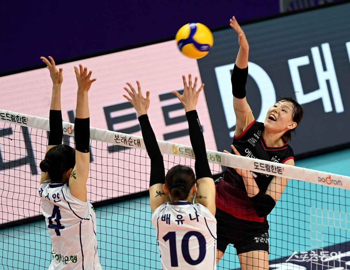31일 경북 구미시 박정희체육관에서 ‘2023 구미-도드람컵 프로배구대회’ 대전 KGC인삼공사와 김천 한국도로공사의 여자부 경기가 열렸다. KGC인삼공사 이선우가 한국도로공사 블로커를 피해 스파이크를 날리고 있다.