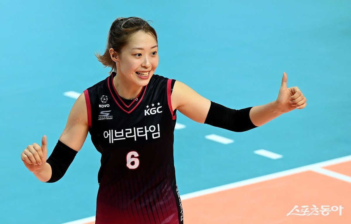 31일 경북 구미시 박정희체육관에서 ‘2023 구미-도드람컵 프로배구대회’ 대전 KGC인삼공사와 김천 한국도로공사의 여자부 경기가 열렸다. KGC인삼공사 박은진이 득점 후 환호하고 있다.