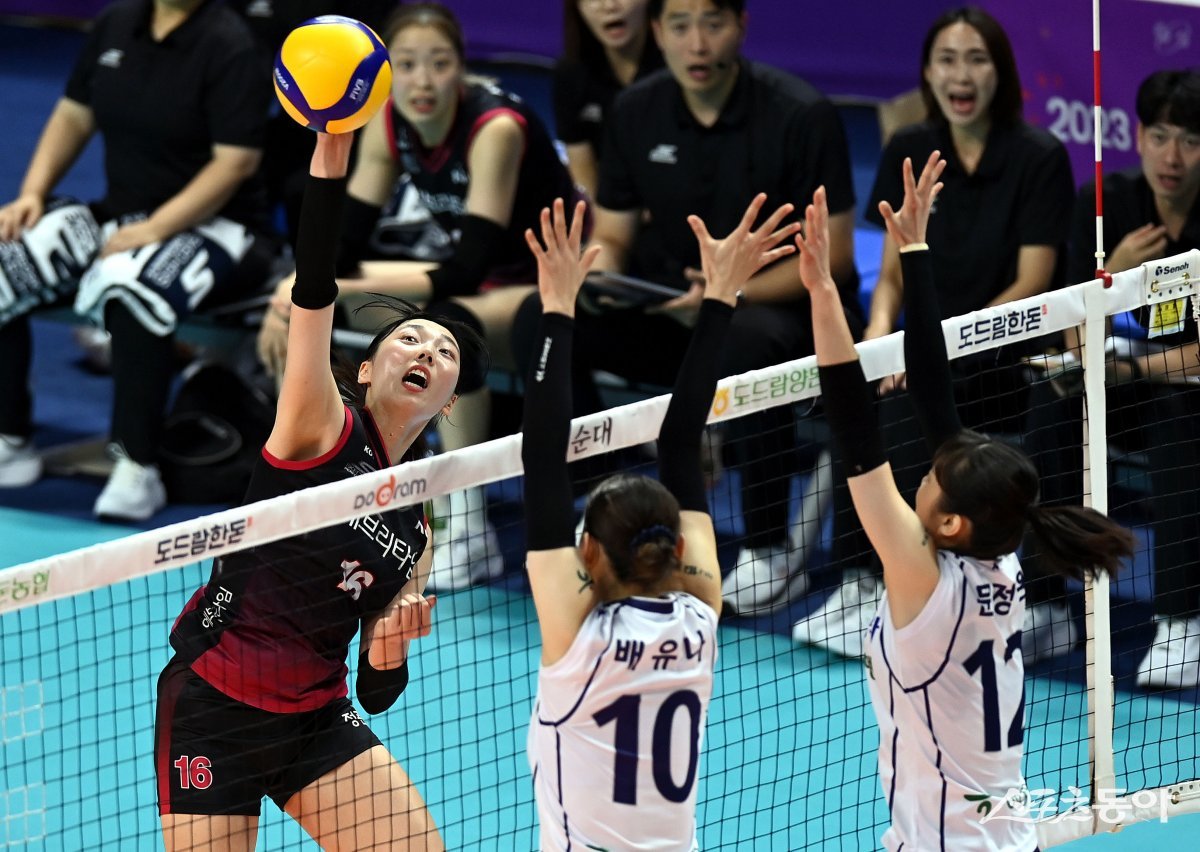 31일 경북 구미시 박정희체육관에서 ‘2023 구미-도드람컵 프로배구대회’ 대전 KGC인삼공사와 김천 한국도로공사의 여자부 경기가 열렸다. KGC인삼공사 고의정이 한국도로공사 블로커를 피해 스파이크를 날리고 있다.
