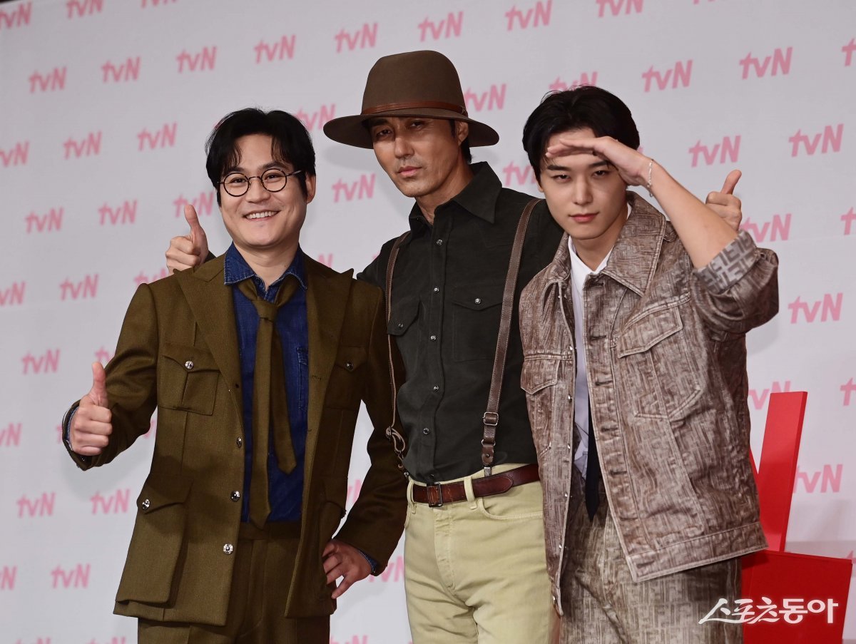 배우 김성균, 차승원, 더보이즈 주연이 1일 서울 마포구 도화동 서울가든호텔에서 열린 tvN 새 예능프로그램 ‘형따라 마야로: 아홉 개의 열쇠’ 제작발표회에서 포즈를 취하고 있다.