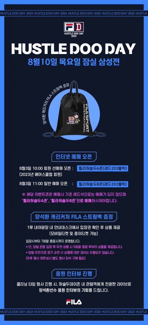 팬들을 위한 다양한 이벤트를 진행한다. 이날 기존 레드 지정석 202~203블록을 ‘휠라 허슬두 A, B존’으로 운영한다. 해당 좌석 입장권 소지자에게는 양석환의 캐리커처가 새겨진 휠라 스트링백을 제공한다.