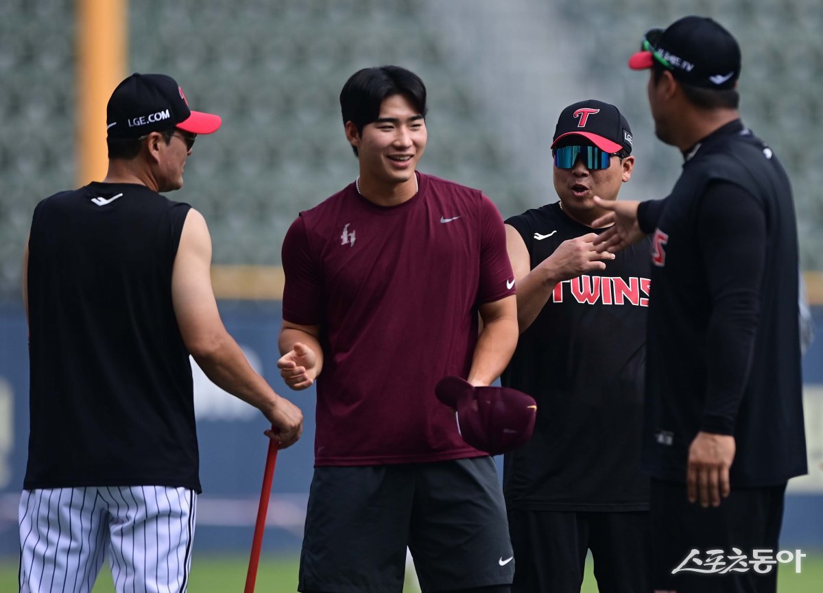 1일 서울 잠실야구장에서 열린 ‘2023 신한은행 SOL KBO리그’ LG 트윈스와 키움 히어로즈의 경기에 앞서 키움 이주형이 LG 코치와 인사를 하고 있다.