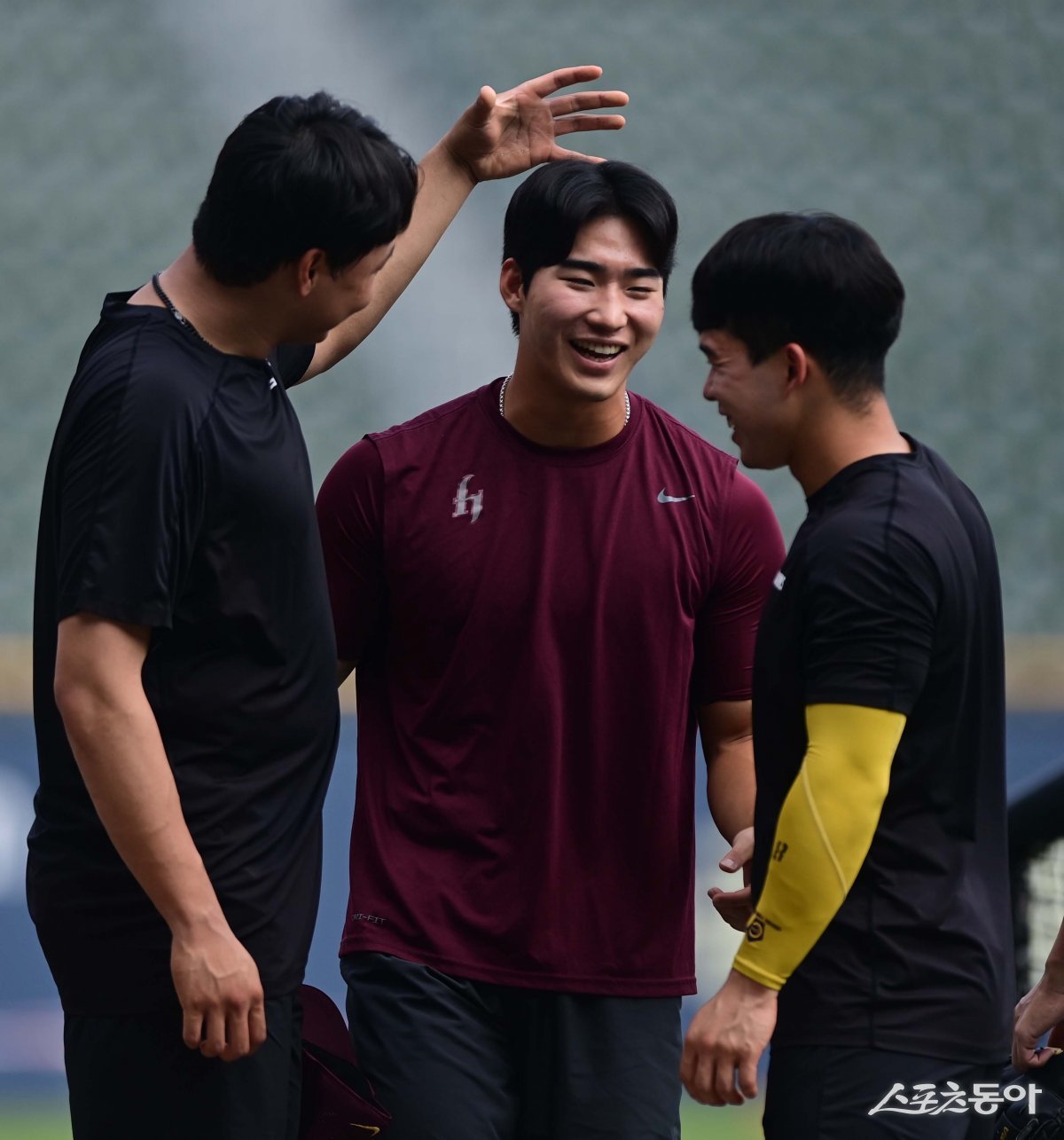 1일 서울 잠실야구장에서 열린 ‘2023 신한은행 SOL KBO리그’ LG 트윈스와 키움 히어로즈의 경기에 엎서 키움 이주형이 LG 이재원, 문성주와 인사하고 있다.