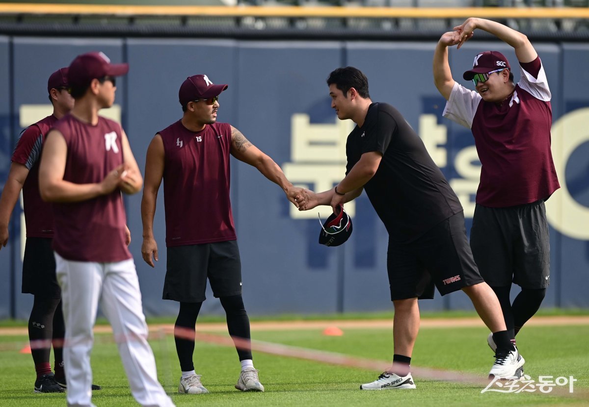 1일 서울 잠실야구장에서 열린 ‘2023 신한은행 SOL KBO리그’ LG 트윈스와 키움 히어로즈의 경기에 앞서 키움 이용규와 LG 최원태가 인사를 하고 있다.