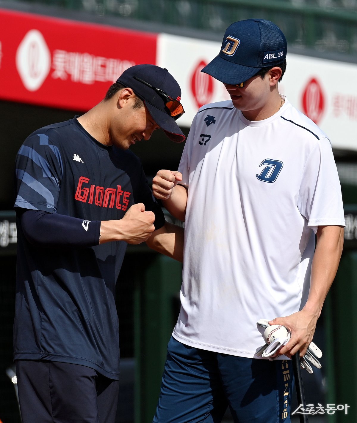 1일 부산 사직야구장에서 ‘2023 신한은행 SOL KBO리그’ 롯데 자이언츠와 NC 다이노스의 경기가 열린다. 경기 전 NC 박민우와 롯데 안권수가 주먹 인사를 하고 있다.