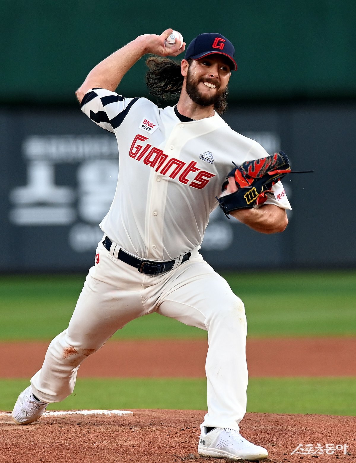 1일 부산 사직야구장에서 ‘2023 신한은행 SOL KBO리그’ 롯데 자이언츠와 NC 다이노스의 경기가 열렸다. 롯데 선발투수 윌커슨이 힘차게 볼을 던지고 있다.