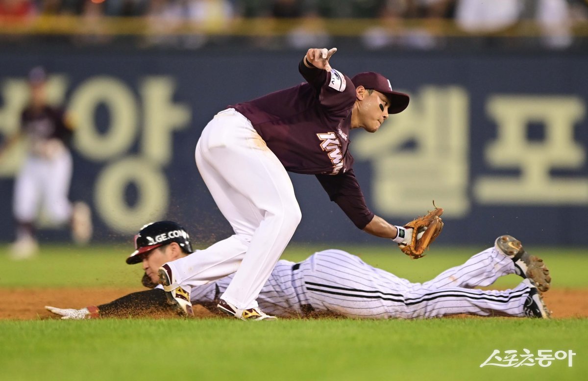 1일 서울 잠실야구장에서 열린 ‘2023 신한은행 SOL KBO리그’ LG 트윈스와 키움 히어로즈의 경기에서 4회말 무사 1루 상황에서 키움 2루수 김태진이 LG 1루주자 오지환에게 도루를 허용하고 있다.