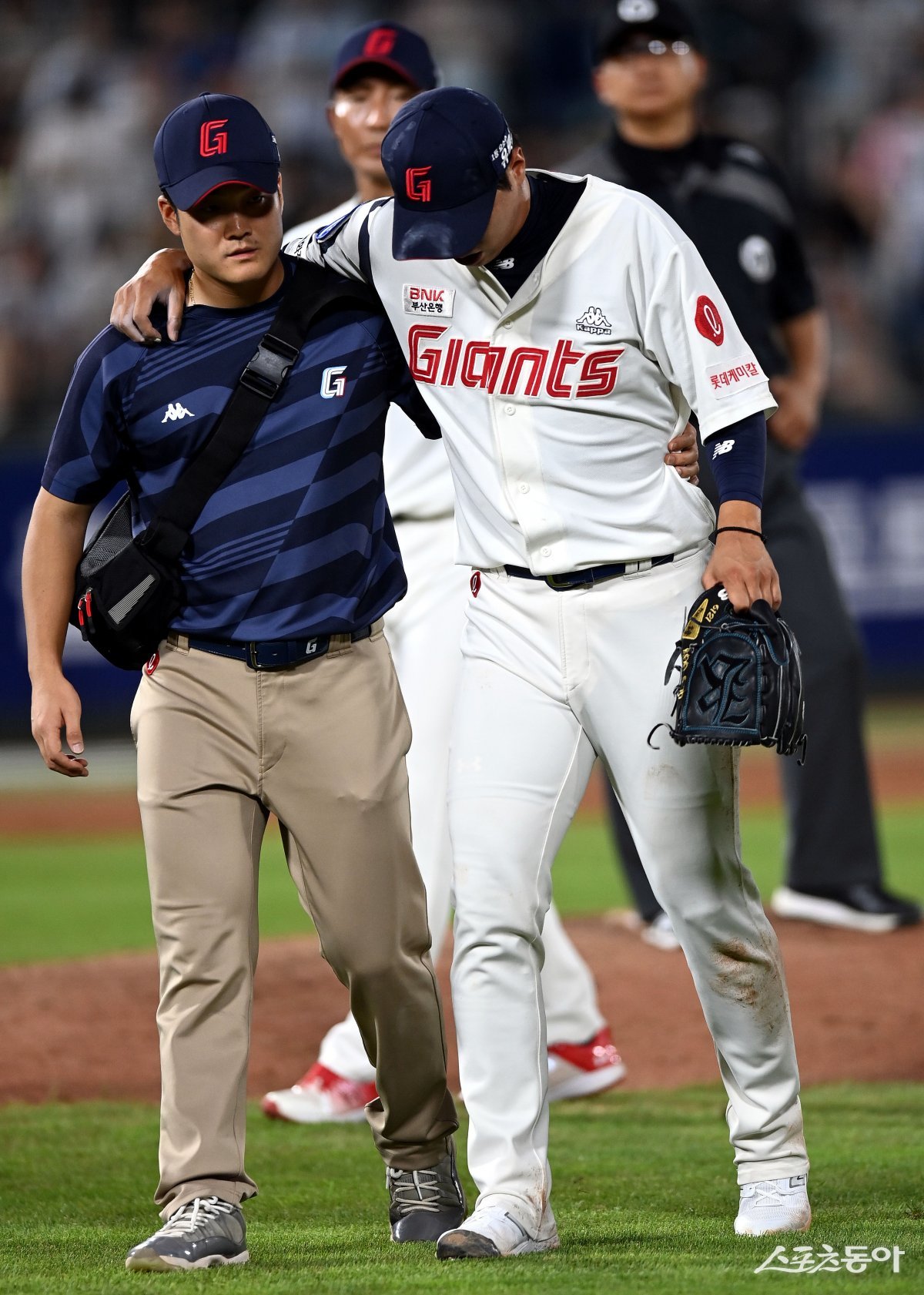1일 부산 사직야구장에서 ‘2023 신한은행 SOL KBO리그’ 롯데 자이언츠와 NC 다이노스의 경기가 열렸다. 7회초 1사 2루에서 타구에 맞은 롯데 구승민이 트레이너의 부축을 받으며 교체되고 있다.