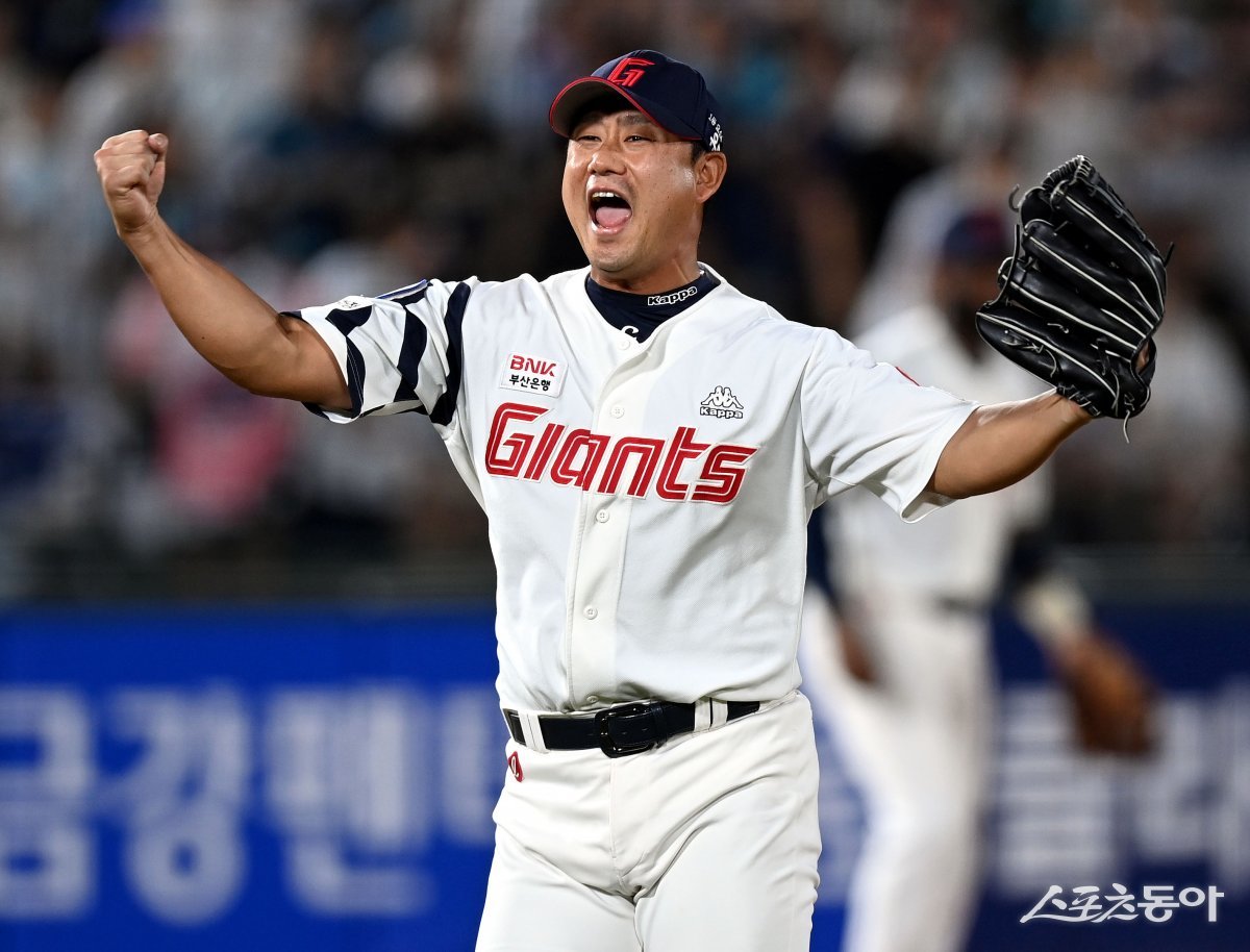 1일 부산 사직야구장에서 ‘2023 신한은행 SOL KBO리그’ 롯데 자이언츠와 NC 다이노스의 경기가 열렸다. 7회초 1사 1, 3루에서 롯데 김상수가 병살 플레이로 위기를 넘긴 후 환호하고 있다.