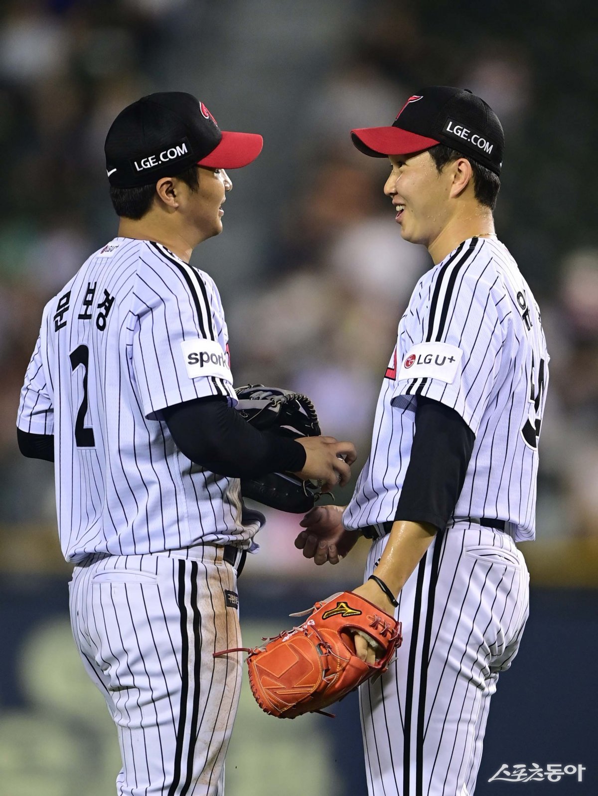 1일 서울 잠실야구장에서 열린 ‘2023 신한은행 SOL KBO리그’ LG 트윈스와 키움 히어로즈의 경기에서 7회초 1사 키움의 내야 땅볼 때 LG 유영찬이 호수비를 펼친 문보경과 기쁨을 나누고 있다.