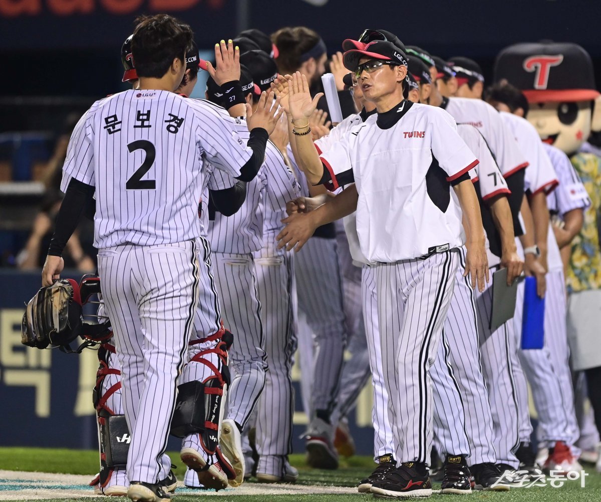 1일 서울 잠실야구장에서 열린 ‘2023 신한은행 SOL KBO리그’ LG 트윈스와 키움 히어로즈의 경기에서 4-2로 승리를 거둔 LG 염경엽 감독이 선수들과 기쁨을 나누고 있다.