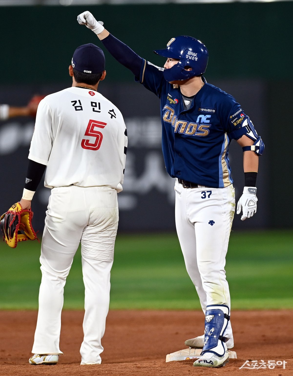1일 부산 사직야구장에서 ‘2023 신한은행 SOL KBO리그’ 롯데 자이언츠와 NC 다이노스의 경기가 열렸다. 연장 11회초 무사에서 NC 박건우가 2루타를 날린 후 환호하고 있다.