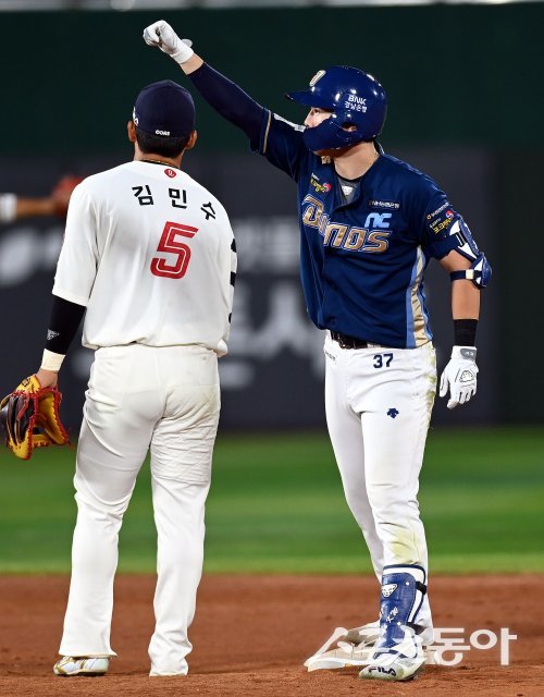 1일 부산 사직야구장에서 ‘2023 신한은행 SOL KBO리그’ 롯데 자이언츠와 NC 다이노스의 경기가 열렸다. 연장 11회초 무사에서 NC 박건우가 2루타를 날린 후 환호하고 있다. 사직 | 김민성 기자 marineboy@donga.com