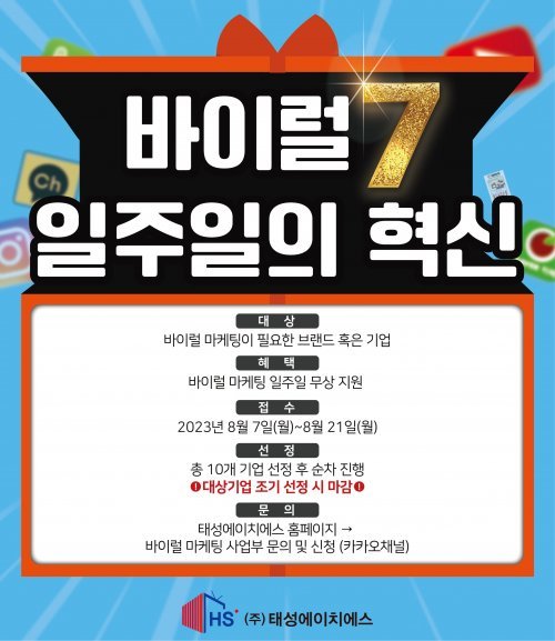 전문 영역 바이럴마케팅 특화 광고기획사 태성에이치에스가 고객사를 위한 바이럴마케팅 무상 선체험 이벤트를 실시한다. ‘바이럴 7, 일주일의 혁신’ 총 10개 고객사 추첨 선정