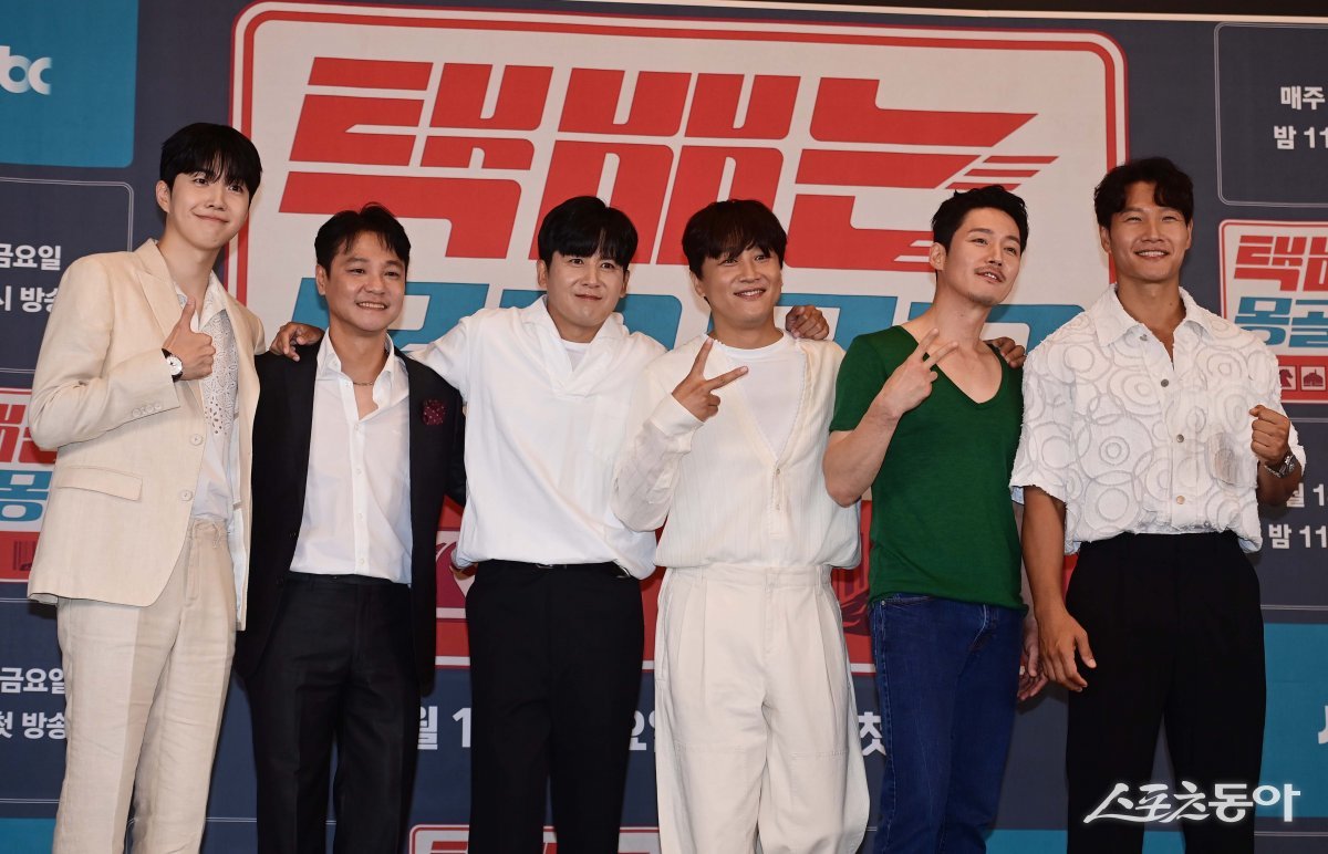 배우 강훈, 홍경인, 가수 홍경민, 배우 차태현, 강훈, 가수 김종국이 2일 서울 서초구 잠원동 더 리버사이드 호텔에서 열린 JTBC 새 예능프로그램 ‘택배는 몽골몽골’ 제작발표회에서 포즈를 취하고 있다.