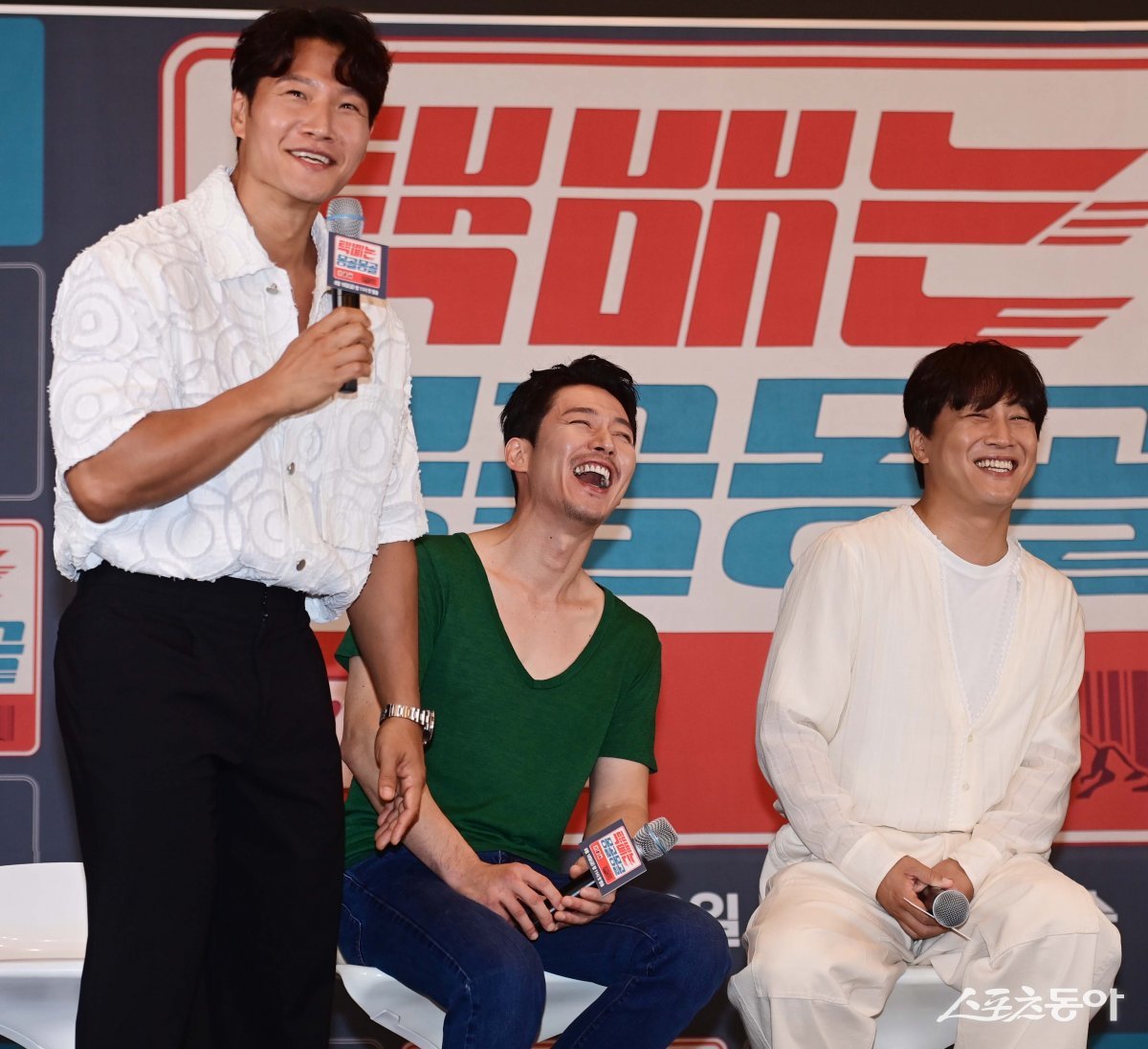 배우 장혁, 차태현이 2일 서울 서초구 잠원동 더 리버사이드 호텔에서 열린 JTBC 새 예능프로그램 ‘택배는 몽골몽골’ 제작발표회에서 김종국의 인사말에 웃고 있다.