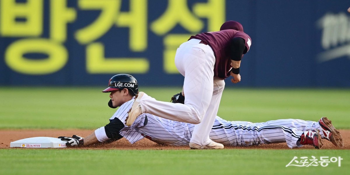2일 서울 잠실야구장에서 열린 ‘2023 신한은행 SOL KBO리그’ LG 트윈스와 키움 히어로즈의 경기에서 1회말 1사 1루 상황에서 LG 1루주자 홍창기가 2루로 도루에 성공하고 있다.