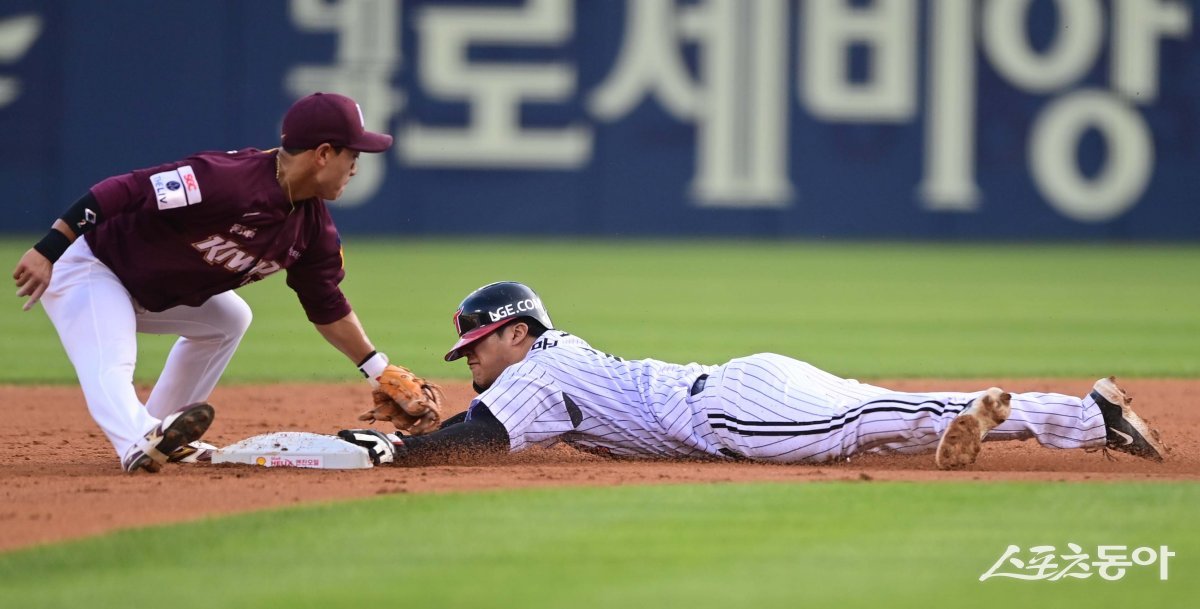 2일 서울 잠실야구장에서 열린 ‘2023 신한은행 SOL KBO리그’ LG 트윈스와 키움 히어로즈의 경기에서 2회말 1사 1루 상황에서 LG 1루주자 문보경이 도루에 성공하고 있다.