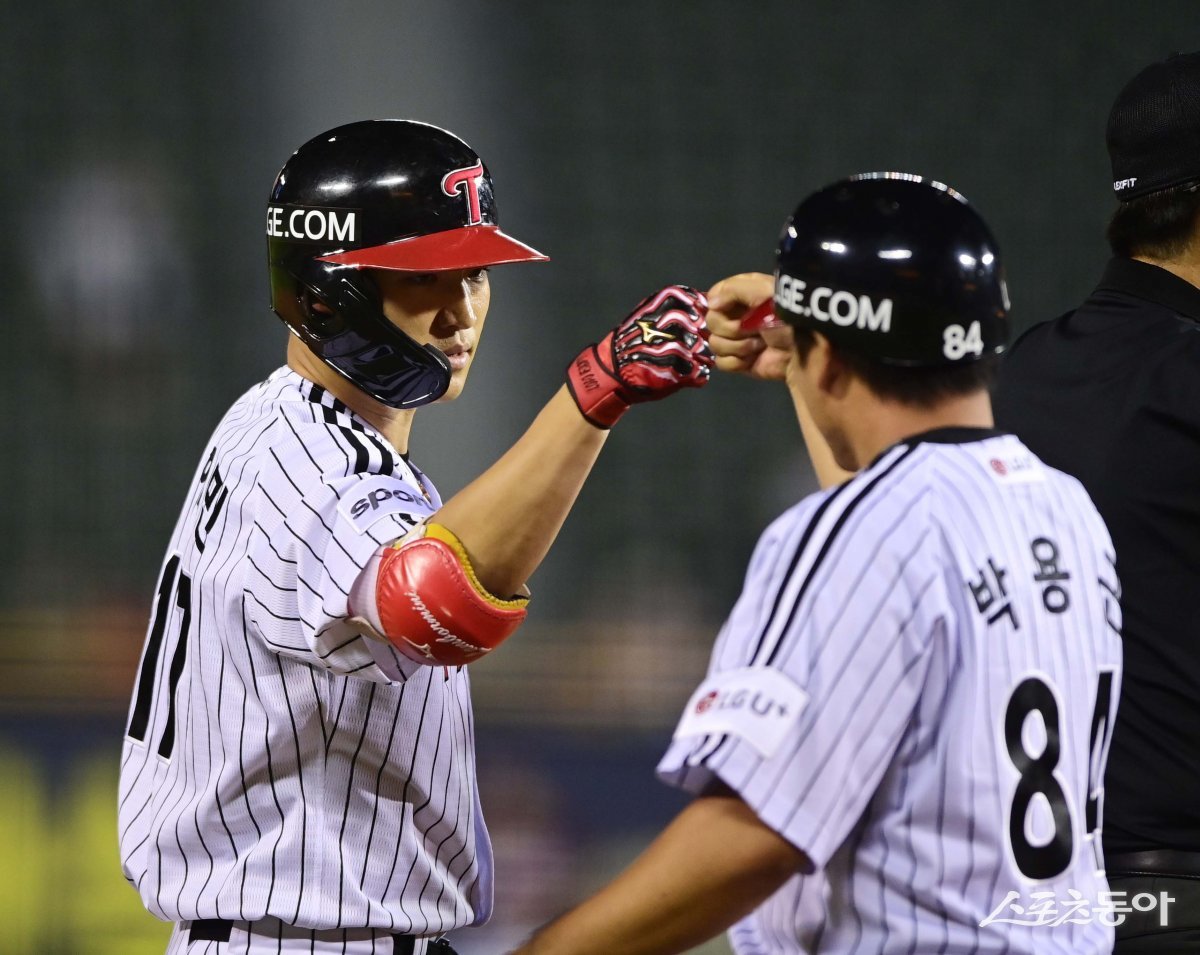 2일 서울 잠실야구장에서 열린 ‘2023 신한은행 SOL KBO리그’ LG 트윈스와 키움 히어로즈의 경기에서 7회말 무사 만루 LG 박해민이 선제 3타점 우전 3루타를 친 후 3루코치와 주먹을 맞대고 있다.