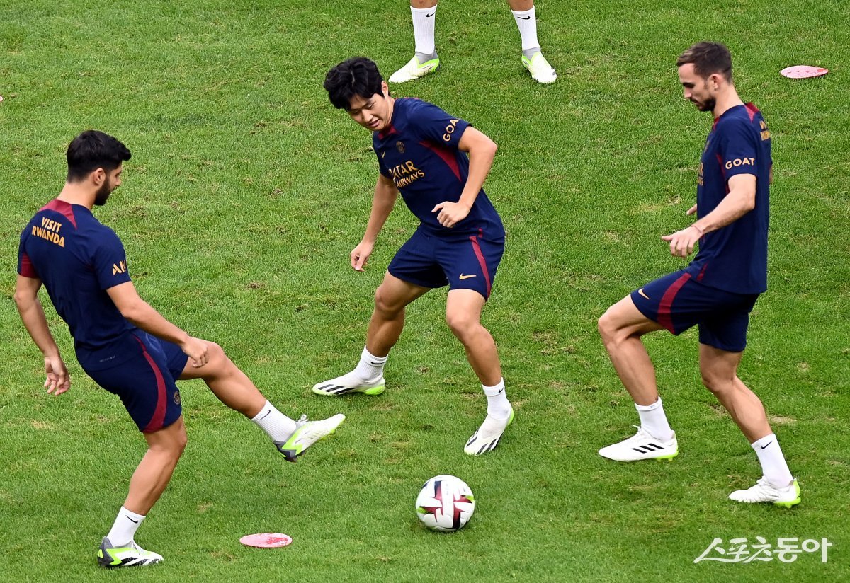 2일 부산아시아드주경기장에서 파리 생제르맹(PSG) K리그1 전북 현대와 쿠팡플레이 3차전을 앞두고 오픈 트레이닝 행사가 열렸다. 이강인이 동료들과 훈련을 하고 있다.