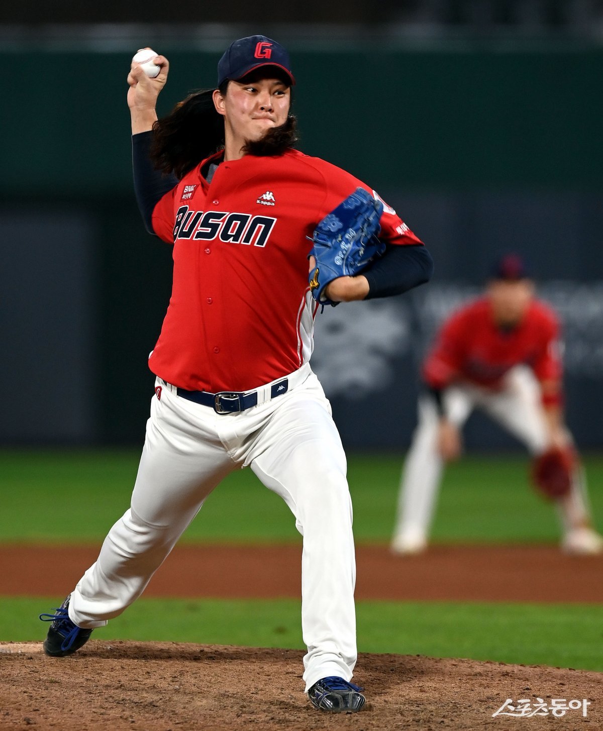 2일 부산 사직야구장에서 ‘2023 신한은행 SOL KBO리그’ 롯데 자이언츠와 NC 다이노스의 경기가 열렸다. 9회초 무사에서 롯데 김원중이 구원 등판해 볼을 던지고 있다.