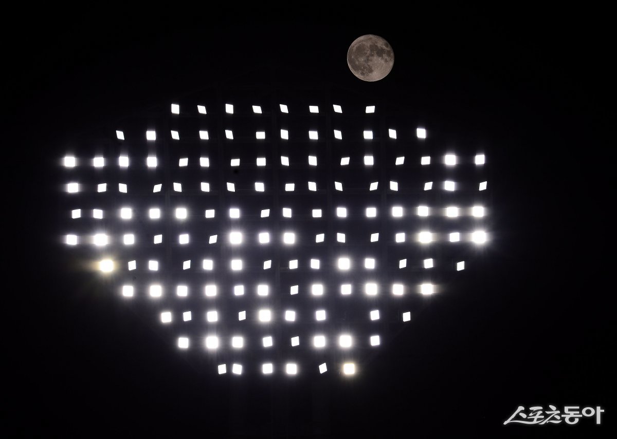 2일 부산 사직야구장에서 ‘2023 신한은행 SOL KBO리그’ 롯데 자이언츠와 NC 다이노스의 경기가 열렸다. 야구장 조명탑 위로 슈퍼문이 떠오르고 있다.