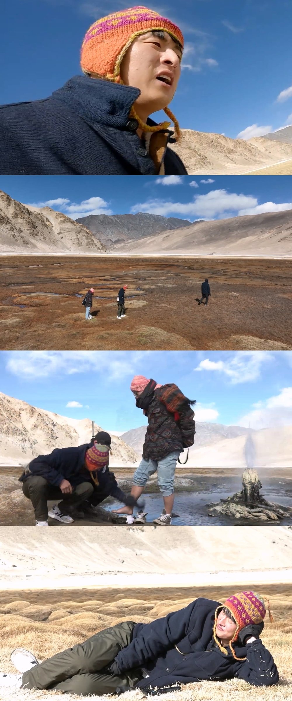 ‘인도 삼형제’는 해발 고도 4,400m 고원 중앙에 위치한 ‘푸가 온천’의 독특한 형태와 영화에서 볼 법한 비현실적인 풍광에 매료된다. 드넓은 대지에 드러누운 기안84와 멀리 펼쳐진 풍경을 눈에 담는 덱스, 그리고 바짓단을 걷어 ‘푸가 온천’에 입수(?)한 빠니보틀의 모습이 눈길을 사로잡는다. 빠니보틀은 따뜻한 온천수에서 발을 담그며 피로를 푼다.