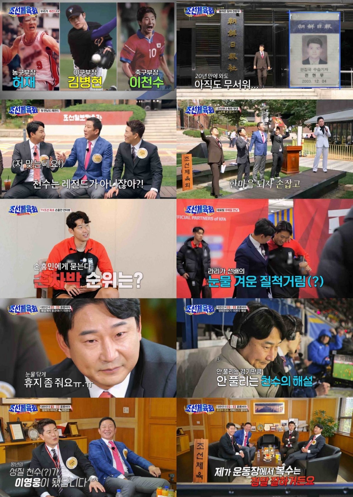 TV CHOSUN의 스포츠 예능 ‘조선체육회’가 각 분야 레전드들과 함께 첫 방송을 선보였다.스포츠계 레전드 허재X김병현X이천수와 예능 레전드 전현무는 발대식 이후 첫 종목 ‘축구’에 도전했고, 해설에 자신감을 보이던 이천수표 중계의 실체가 드러났다.