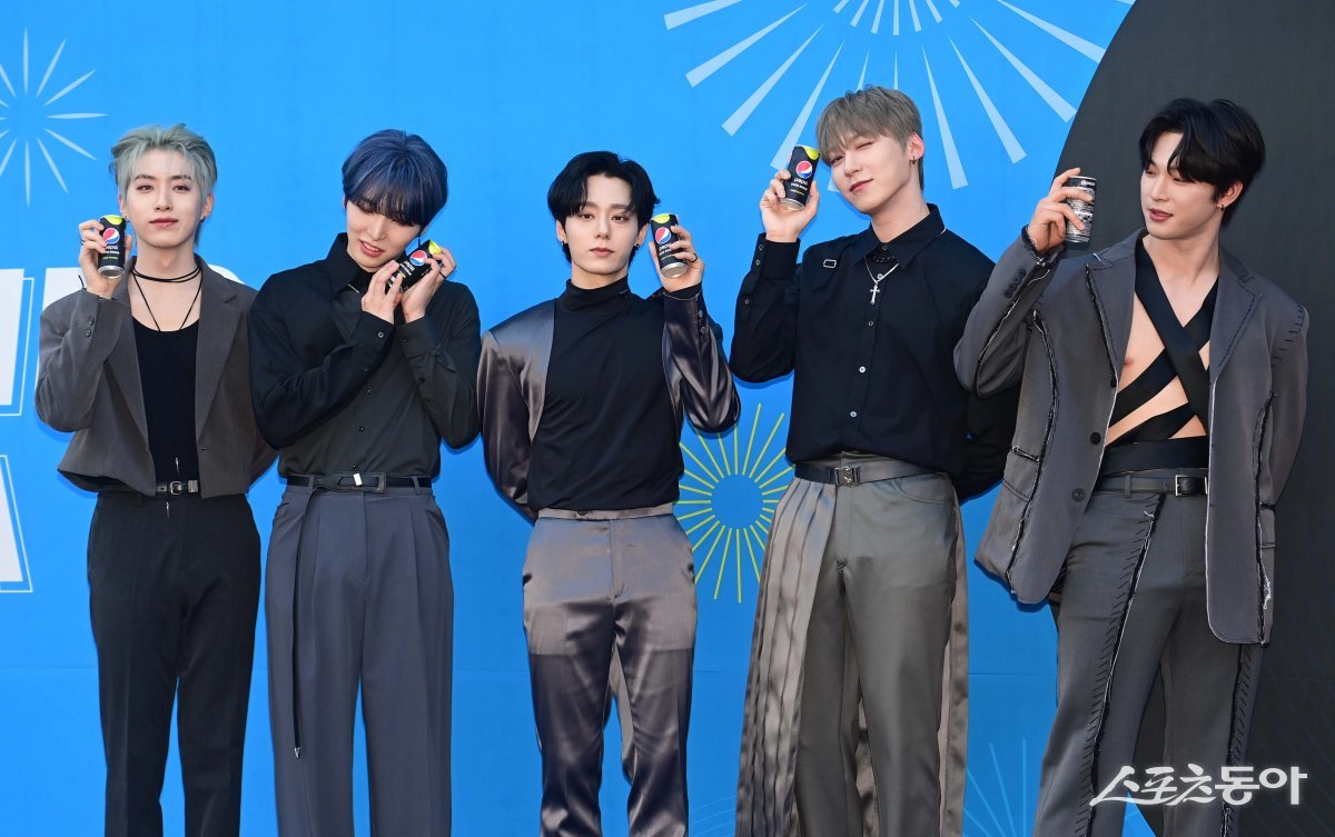 그룹 원어스가 3일 서울 잠실실내체육관에서 열린 ‘펩시 썸머 페스타 2023’ 블루카펫에서 포즈를 취하고 있다.