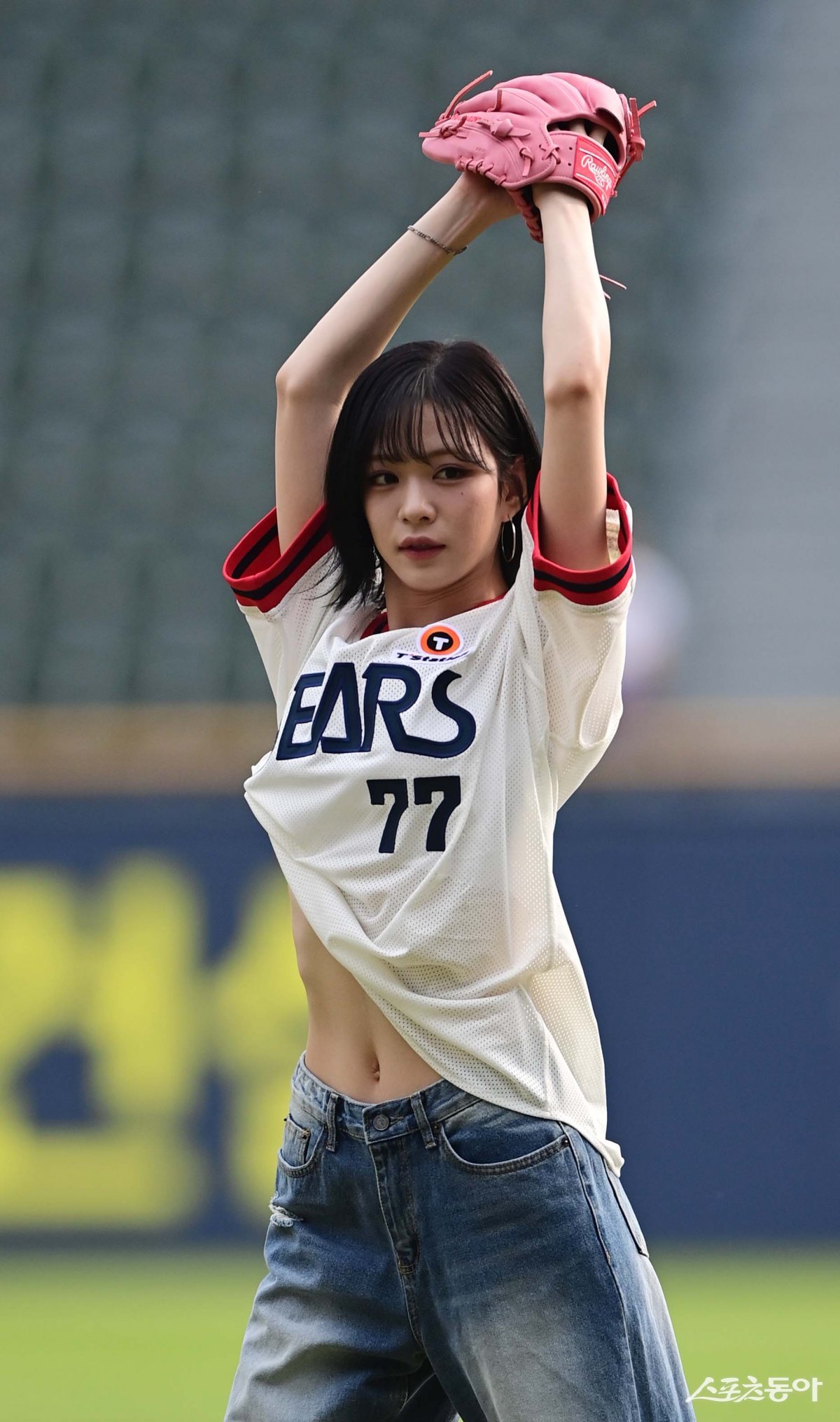 6일 서울 잠실야구장에서 열린 ‘2023 신한은행 SOL KBO리그’ 두산 베어스와 KT 위즈의 경기에 앞서 프로미스나인 이채영이 시구를 하고 있다.