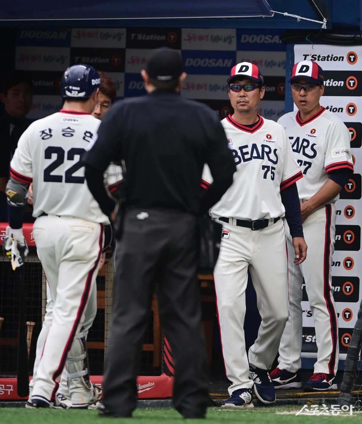 6일 서울 잠실야구장에서 열린 ‘2023 신한은행 SOL KBO리그’ 두산 베어스와 KT 위즈의 경기에서 5회말 무사 1루 두산 이승엽 감독과 김한수 코치가 장승현의 부상으로 인한 통증 호소에 놀라고 있다.