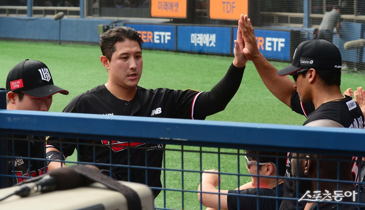 6일 서울 잠실야구장에서 열린 ‘2023 신한은행 SOL KBO리그’ 두산 베어스와 KT 위즈의 경기에서 1회초 선제 1타점 적시타를 친 KT 황재균이 더그아웃에서 동료들의 축하를 받고 있다.