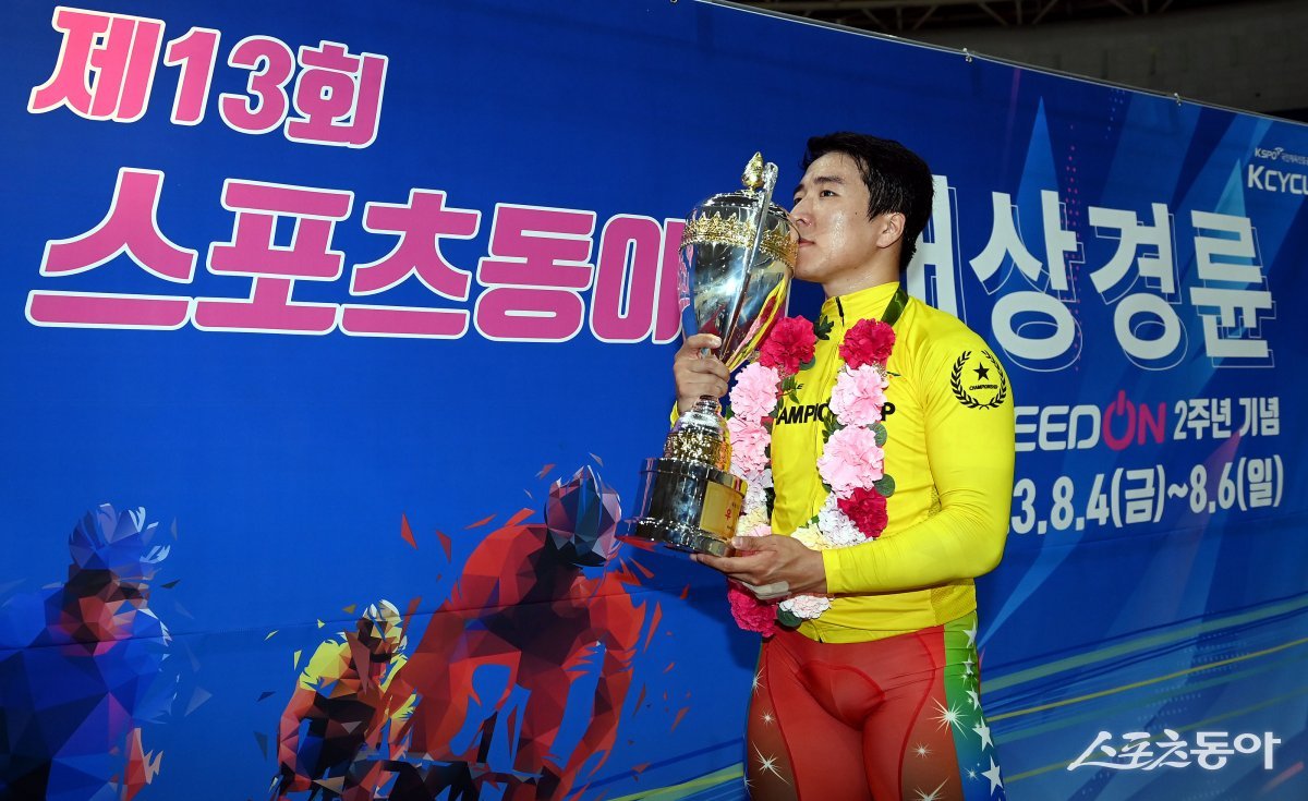 6일 경기도 광명스피돔에서 열린 ‘제13회 스포츠동아배 대상경륜’ 결승전에서 우승을 차지한 임채빈이 트로피에 키스를 하고 있다.