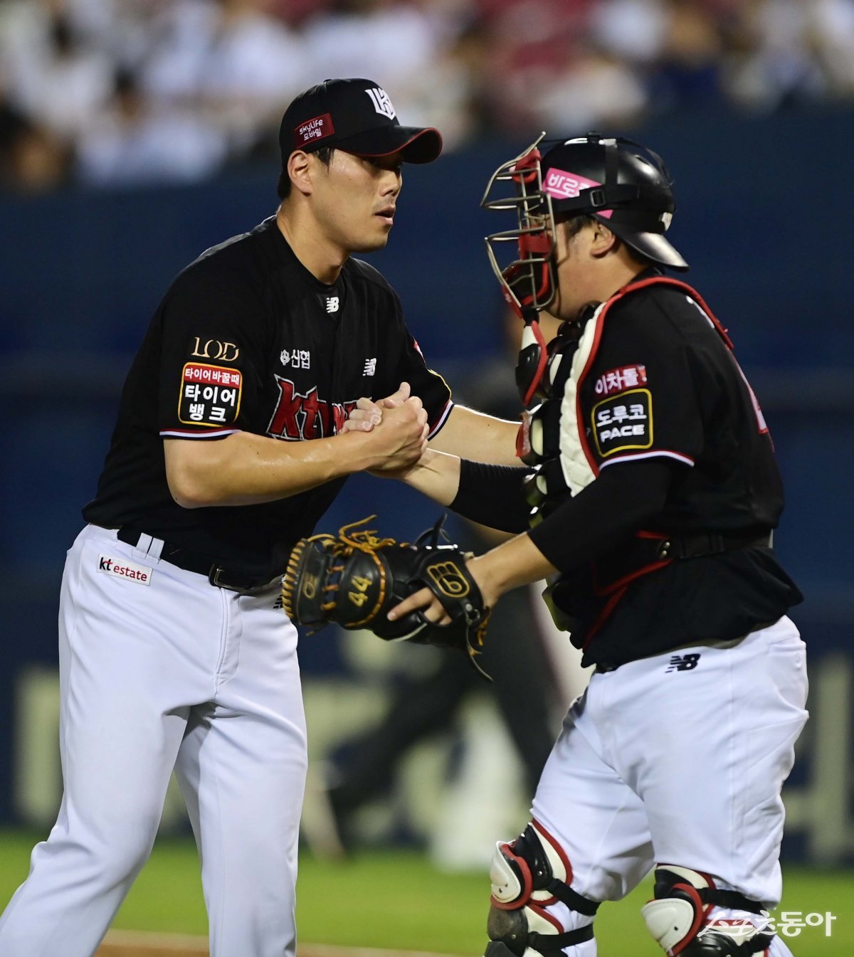 6일 서울 잠실야구장에서 열린 ‘2023 신한은행 SOL KBO리그’ 두산 베어스와 KT 위즈의 경기에서 3-1로 승리한 KT 김재윤이 포수와 기쁨을 나누고 있다.