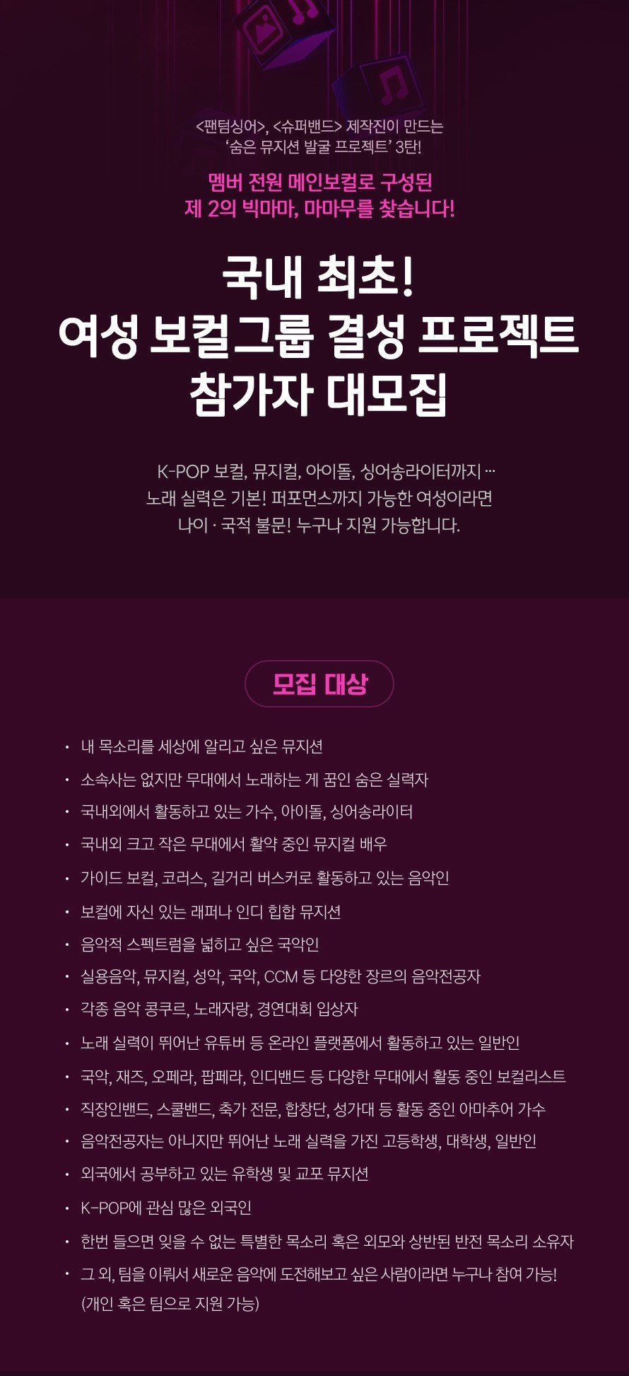 세 번째 프로젝트는 7일부터 지원자 모집을 시작한다. JTBC 공식 홈페이지를 통해 지원 가능하다. 자세한 일정 및 지원 방법 역시 홈페이지에서 확인할 수 있다. K-POP, 뮤지컬, 아이돌, 재즈, 힙합, 국악, 성악, 유튜버 등 장르, 전공 유무와 관계없이 새로운 음악에 도전해보고 싶은 여성이라면 누구나 참여할 수 있다. 개인 또는 팀으로 접수 가능하다.