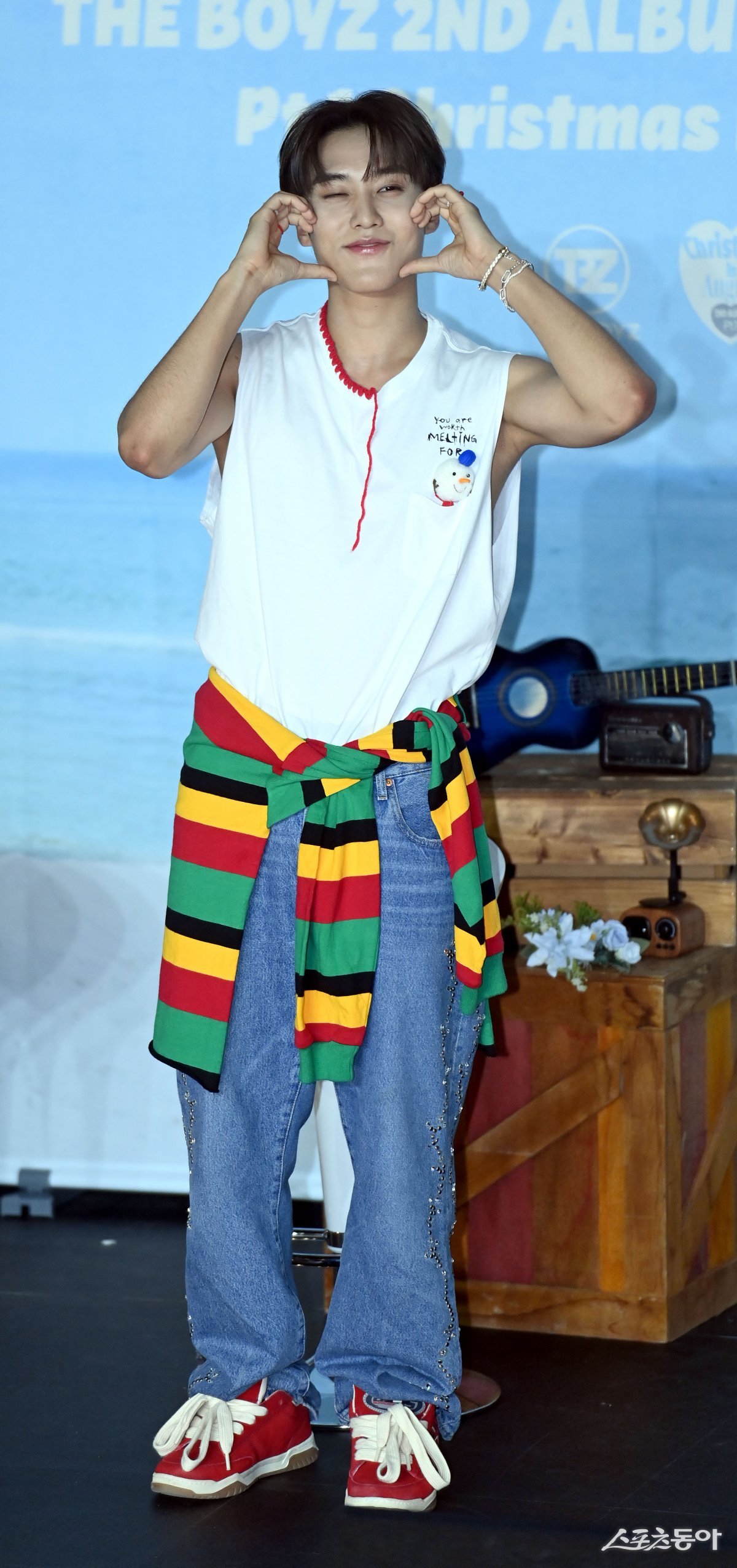 그룹 더보이즈(THE BOYZ) 제이콥이 7일 서울 영등포구 영등포CGV에서 진행된 정규 2집 ‘판타지’ 파트1 ‘8월의 크리스마스’ 발매 쇼케이스에서 포토타임을 갖고 있다.