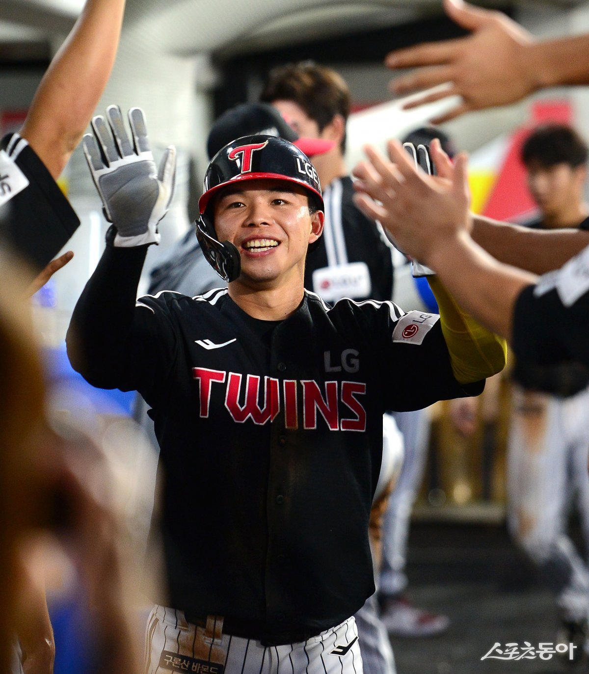 8일 광주 KIA챔피언스필드에서 ‘2023 신한은행 SOL KBO리그’ LG 트윈스와 KIA 타이거즈 경기가 열렸다. 2회초 무사 2루 LG 2루타 때 2루주자 문성주가 득점에 성공한 후 하이파이브 하고 있다.