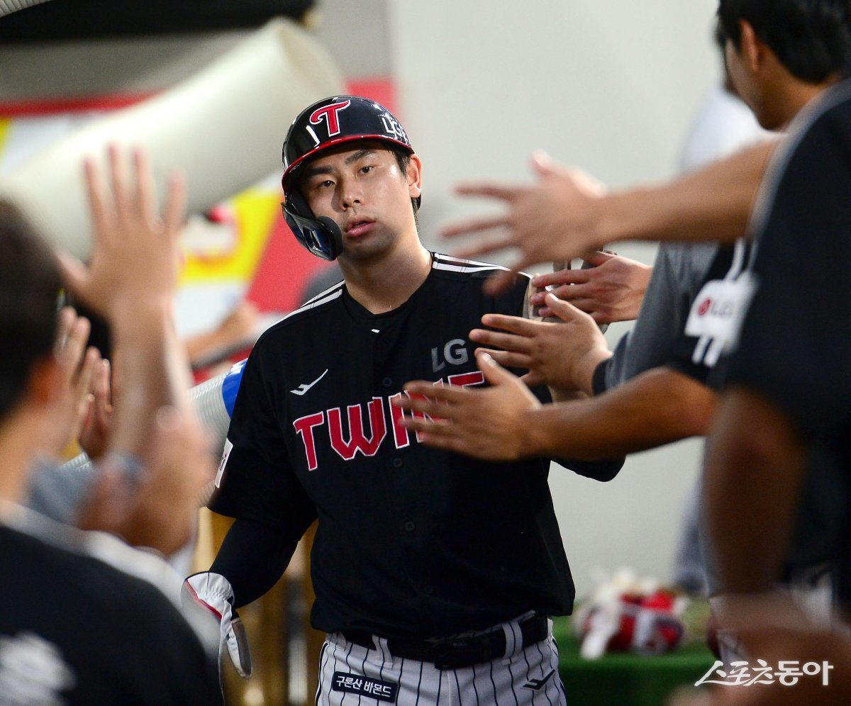 8일 광주 KIA챔피언스필드에서 ‘2023 신한은행 SOL KBO리그’ LG 트윈스와 KIA 타이거즈 경기가 열렸다. 2회초 무사 2루 LG 2루타 때 2루주자 홍창기가 득점에 성공한 후 하이파이브 하고 있다.
