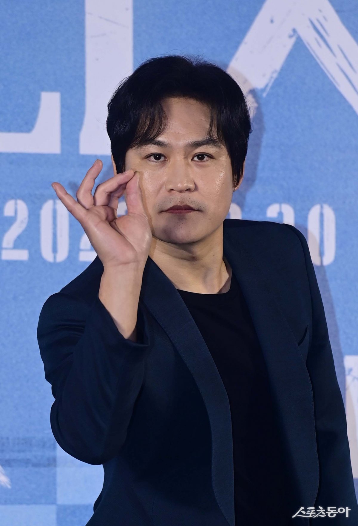 배우 김성균이 9일 서울 성동구 성수동 메가박스 성수점에서 열린 영화 ‘타겟’ 제작보고회에서 포즈를 취하고 있다.