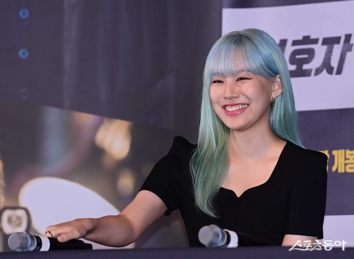배우 박유나가 9일 서울 광진구 자양동 롯데시네마 건대입구점에서 열린 영화 ‘보호자’ 언론시사회에서 인사말을 마친 후 웃고 있다.