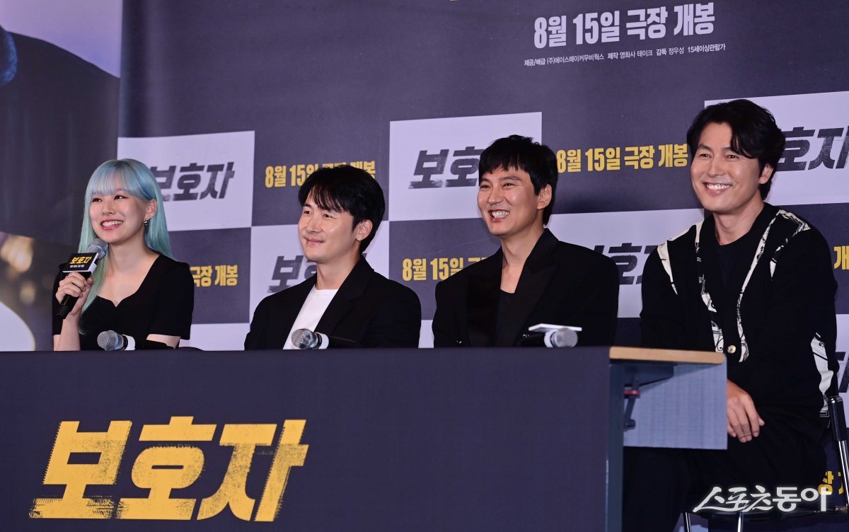 배우 김준한, 김남길, 감독 정우성이 9일 서울 광진구 자양동 롯데시네마 건대입구점에서 열린 영화 ‘보호자’ 언론시사회에서 박유나의 답변에 웃고 있다.