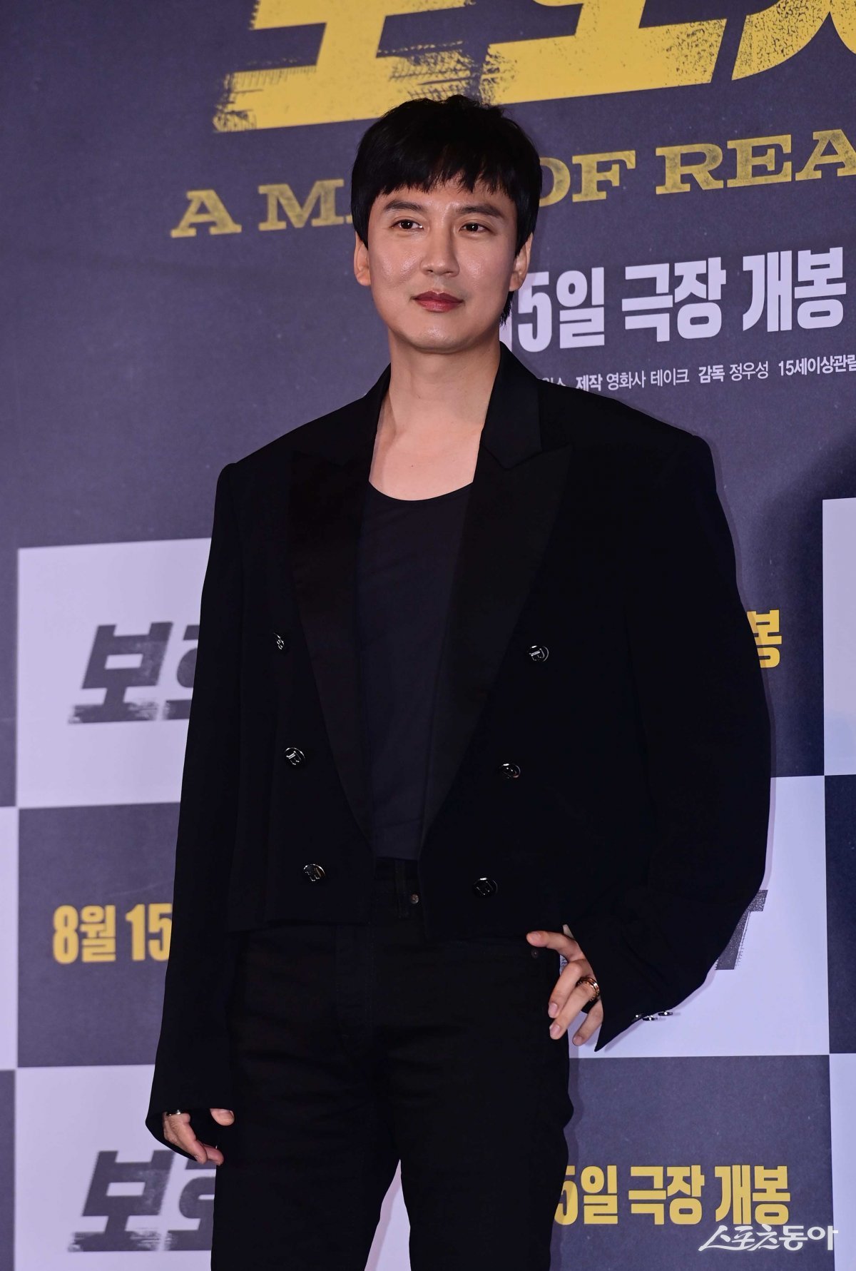 배우 김남길이 9일 서울 광진구 자양동 롯데시네마 건대입구점에서 열린 영화 ‘보호자’ 언론시사회에서 포즈를 취하고 있다.