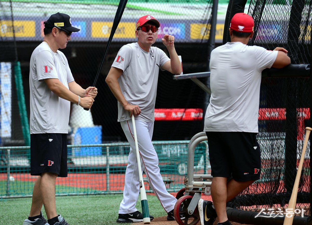 9일 인천 SSG 랜더스필드에서 ‘2023 신한은행 SOL KBO리그’ SSG 랜더스와 NC 다이노스의 경기가 열린다. 경기 전 SSG 김원형 감독이 코치들과 이야기를 나누고 있다.