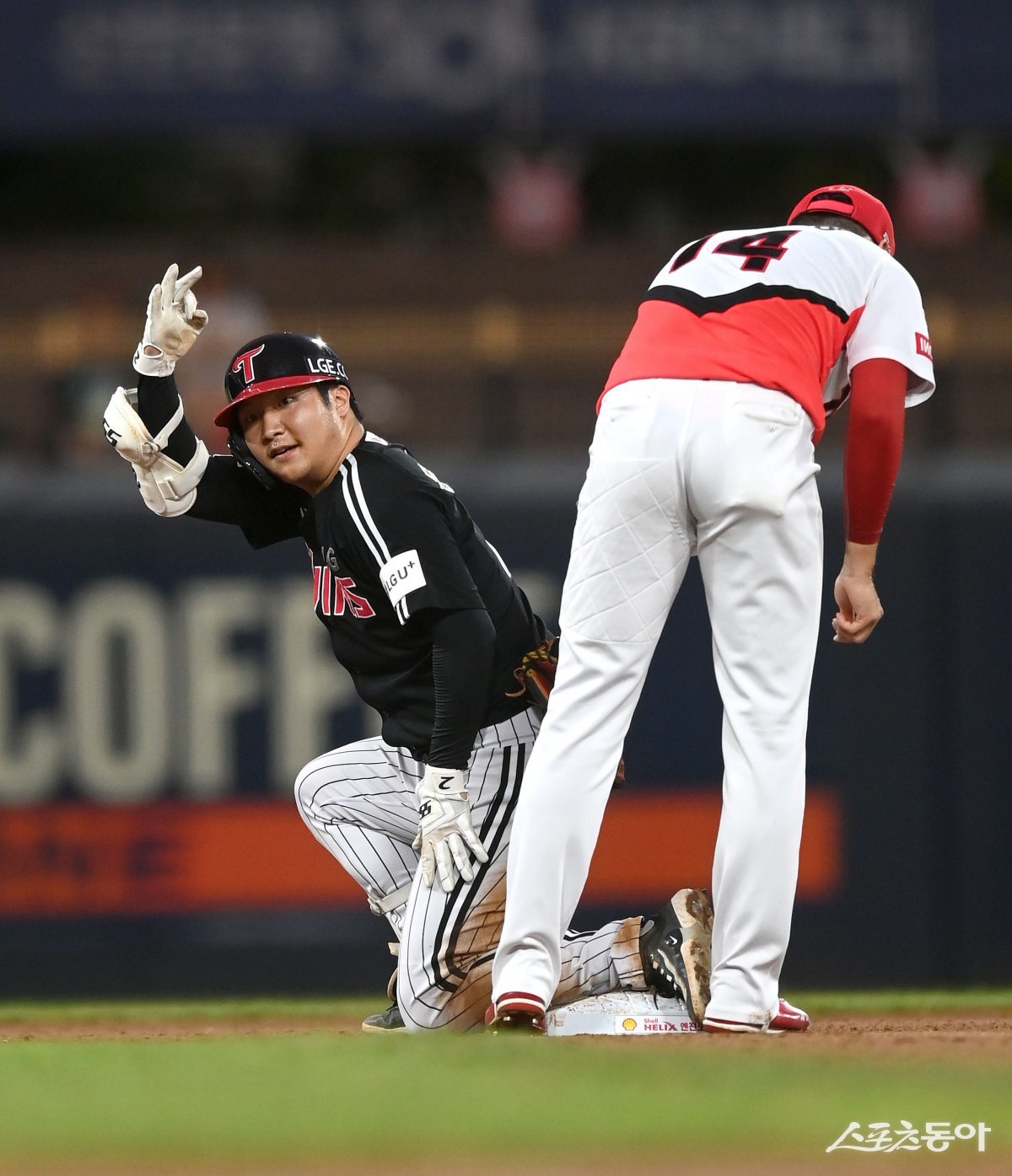 9일 광주-기아챔피언스필드에서 ‘2023 신한은행 SOL KBO리그’ LG 트윈스와 KIA 타이거즈 경기가 열렸다. 4회초 1사 LG 문보경이 좌전 안타를 치고 2루까지 달려 세이프 되고 있다.