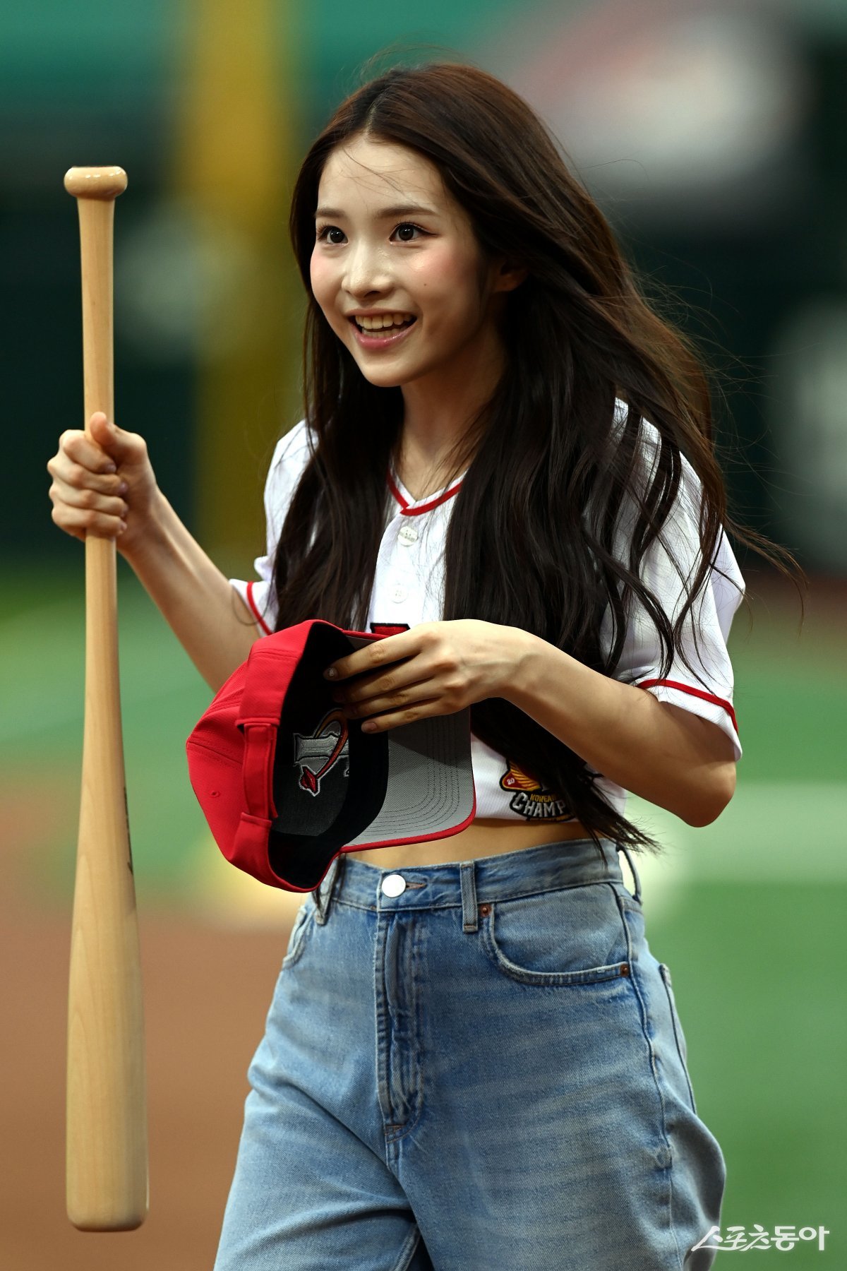 9일 인천 SSG 랜더스필드에서 ‘2023 신한은행 SOL KBO리그’ SSG 랜더스와 NC 다이노스의 경기가 열렸다. 걸그룹 에이디야(ADYA) 서원이 시타를 준비하고 있다.